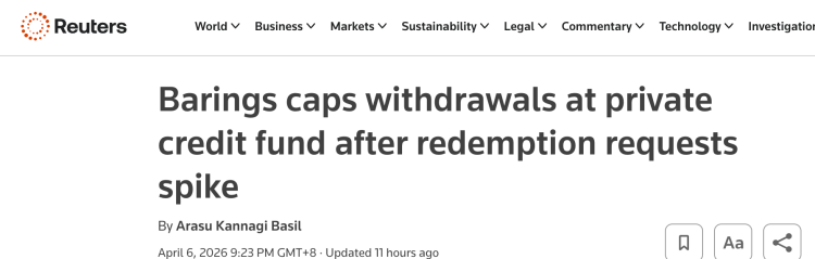 【环球网财经综合报道】据路透社消息,资产管理公司Barings旗下的一只私人信贷基金在赎回请求激增后,将赎回上限设为份额的5%,这是近几个月来一系列资产管理公司采取的类似举措中的最新一例。
