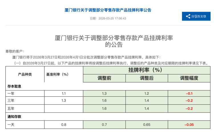 【环球网财经综合报道】4月以来,多家中小银行密集下调存款挂牌利率。据厦门银行公告,自4月1日起,一年、三年、五年期定期存款年化利率分别降至1.2%、1.4%、1.4%,较此前各下调10、20、20个基点。