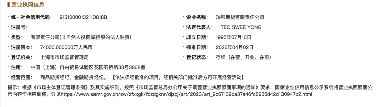 据国家企业信用信息公示系统,该公司成立于1995年7月,法定代表人为TEO SWEE YONG,经营范围涵盖商品期货经纪和金融期货经纪。